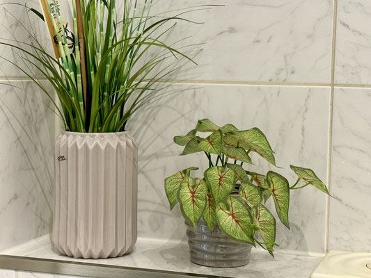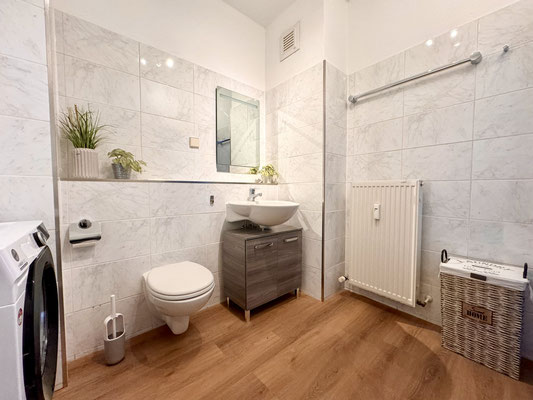 Das Bad besitzt eine Dusche, einen Badblock zum Verstauen von Kosmetikartikeln und eine Waschmaschine. Die