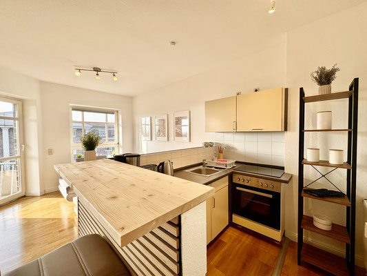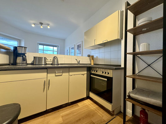 besitzt einen Herd mit Ofen und Ceranfeld und eine Kühl-, Gefrierkombination. Zudem verfügt Sie über einen Tresen mit 2 Stühlen.