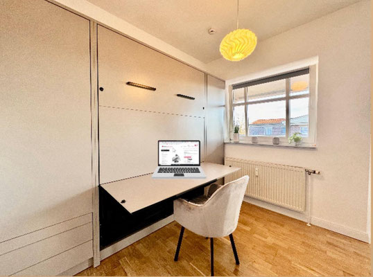 Emma One Matratze ausgestattetes Schrankbett. Dieses bietet im hochgeklappten Zustand die Möglichkeit es als Schreibtisch zu nutzen. Somit steht auch dem Arbeiten im Homeoffice nichts entgegen.